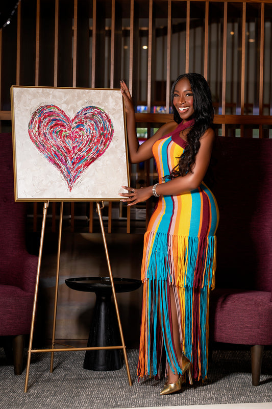 A Heart in Every Home is a deeply personal and evolving body of work by Dunnie the Artist, first sparked by her 2021 painting “Eternal Love” from the Endless Summer Collection. Since then, the heart has remained her central motif symbolizing connection, vulnerability, joy, and emotional truth. As the series grows, it mirrors Dunnie’s own journey through love and life, while reflecting the world’s collective longing for meaning and healing.