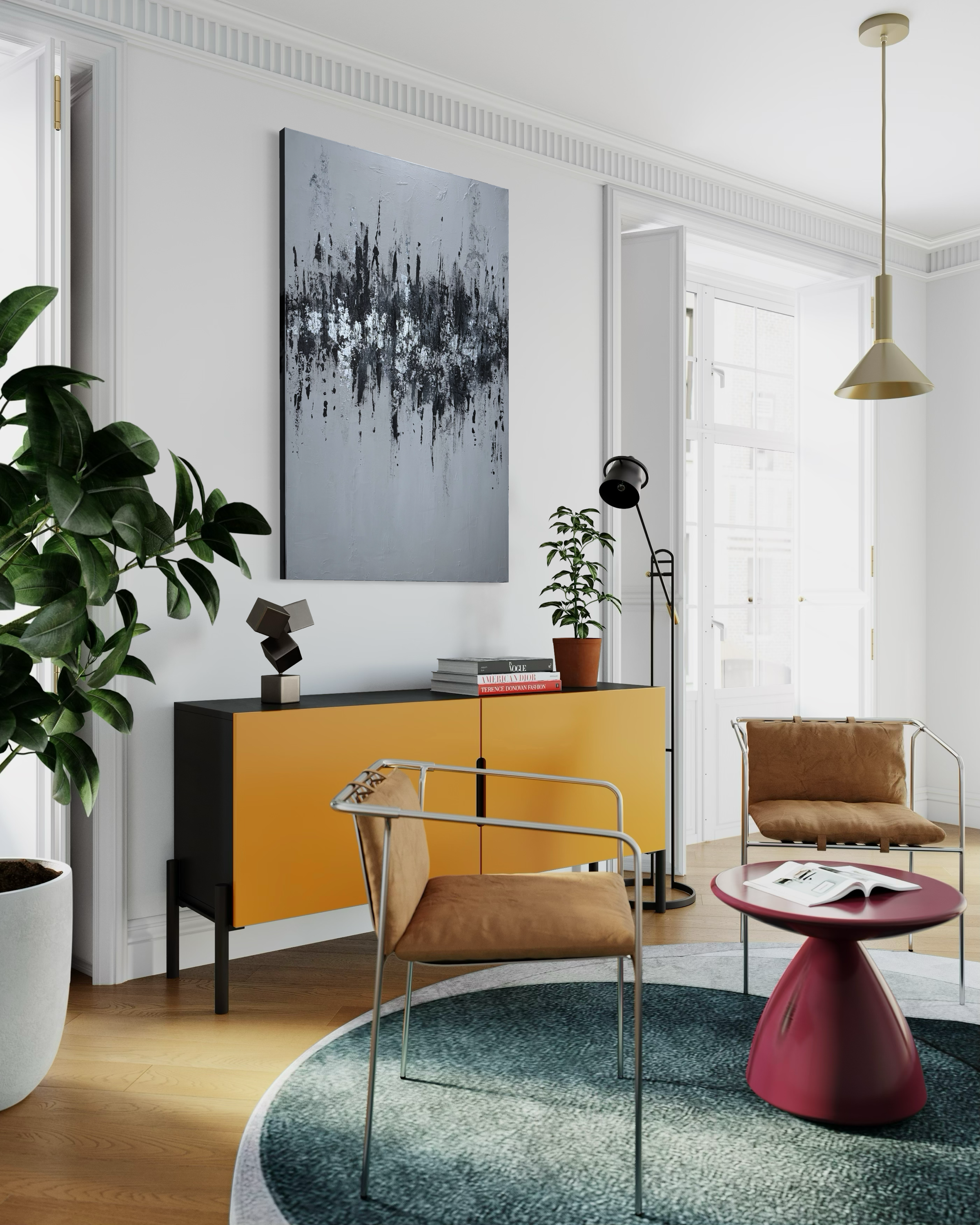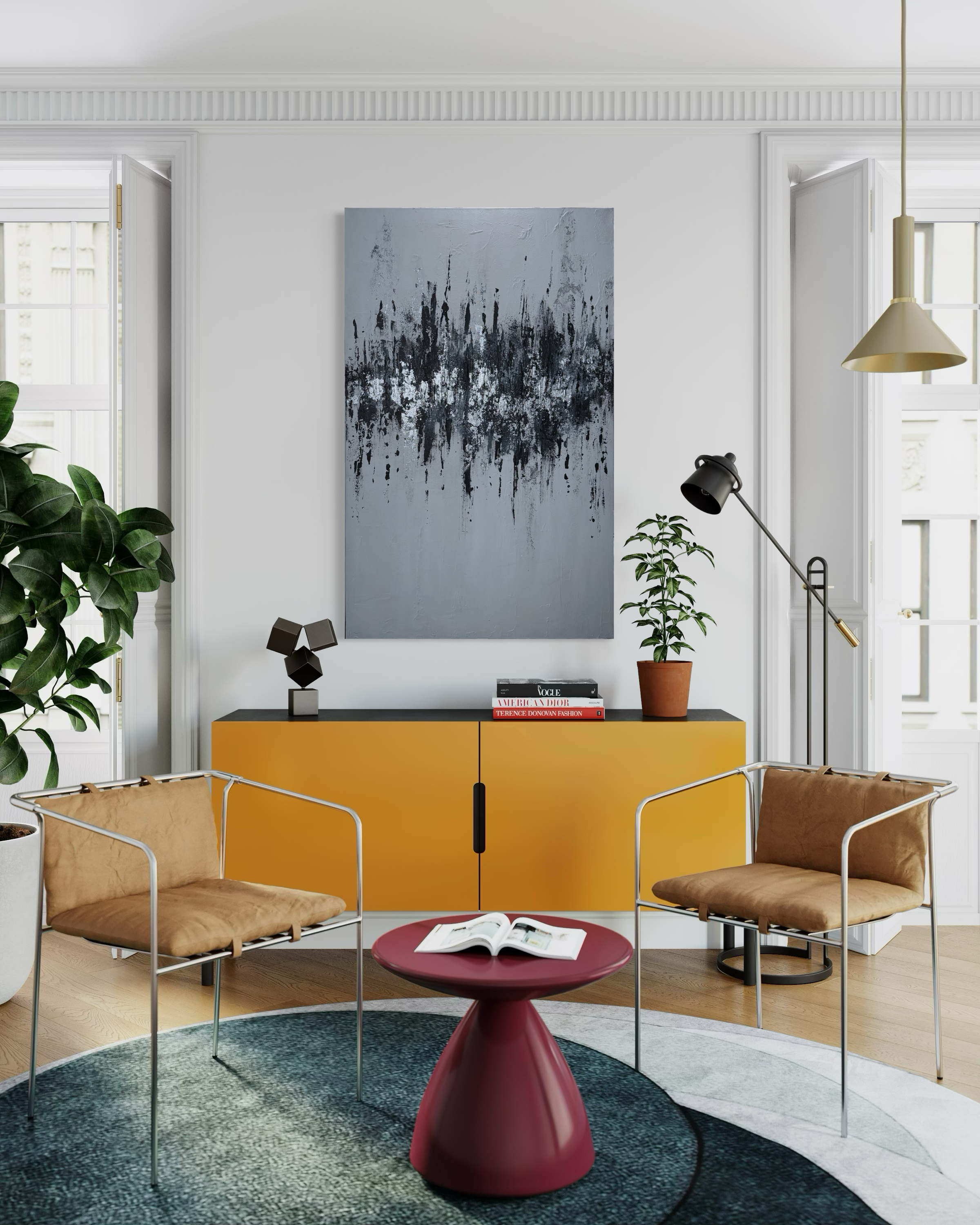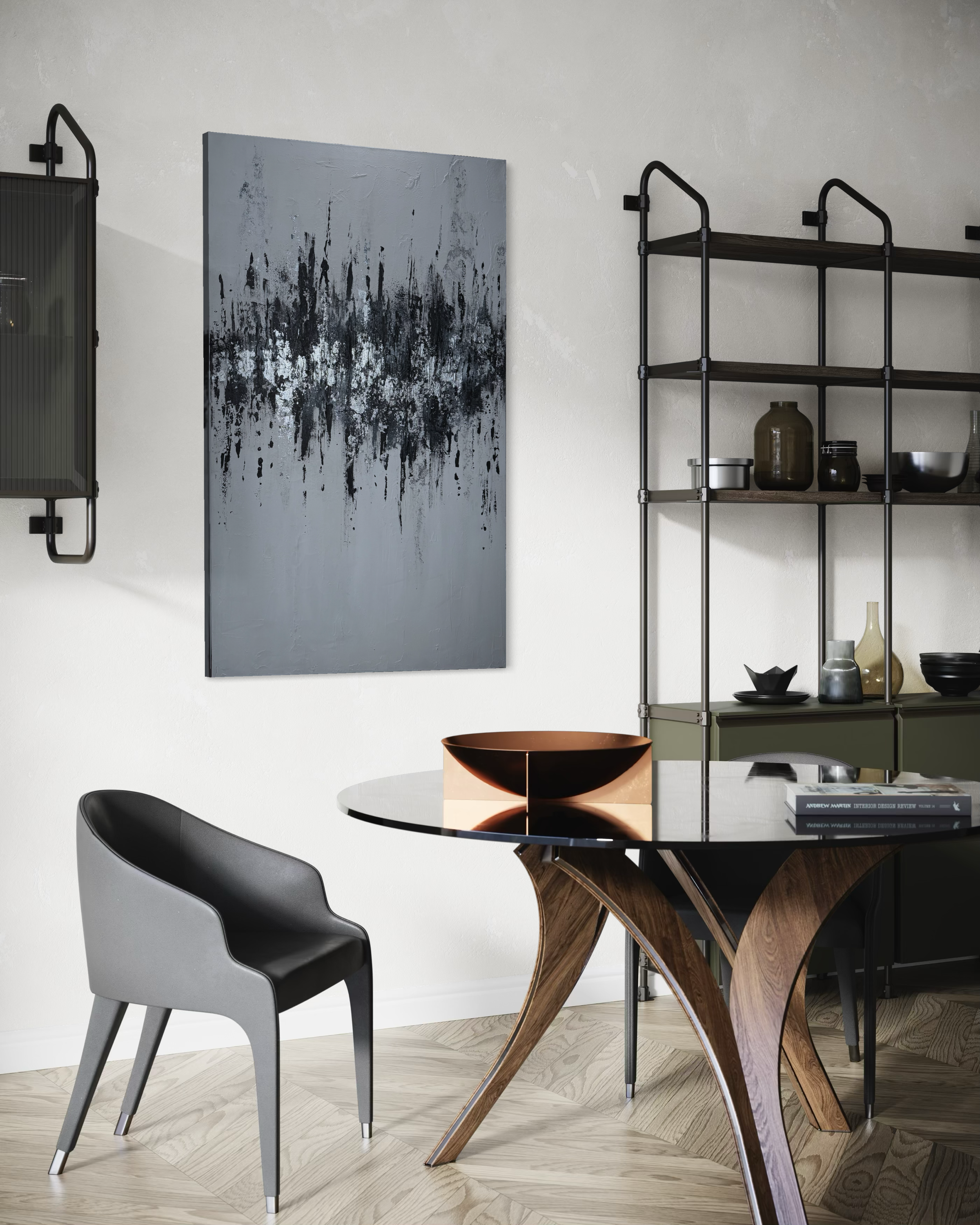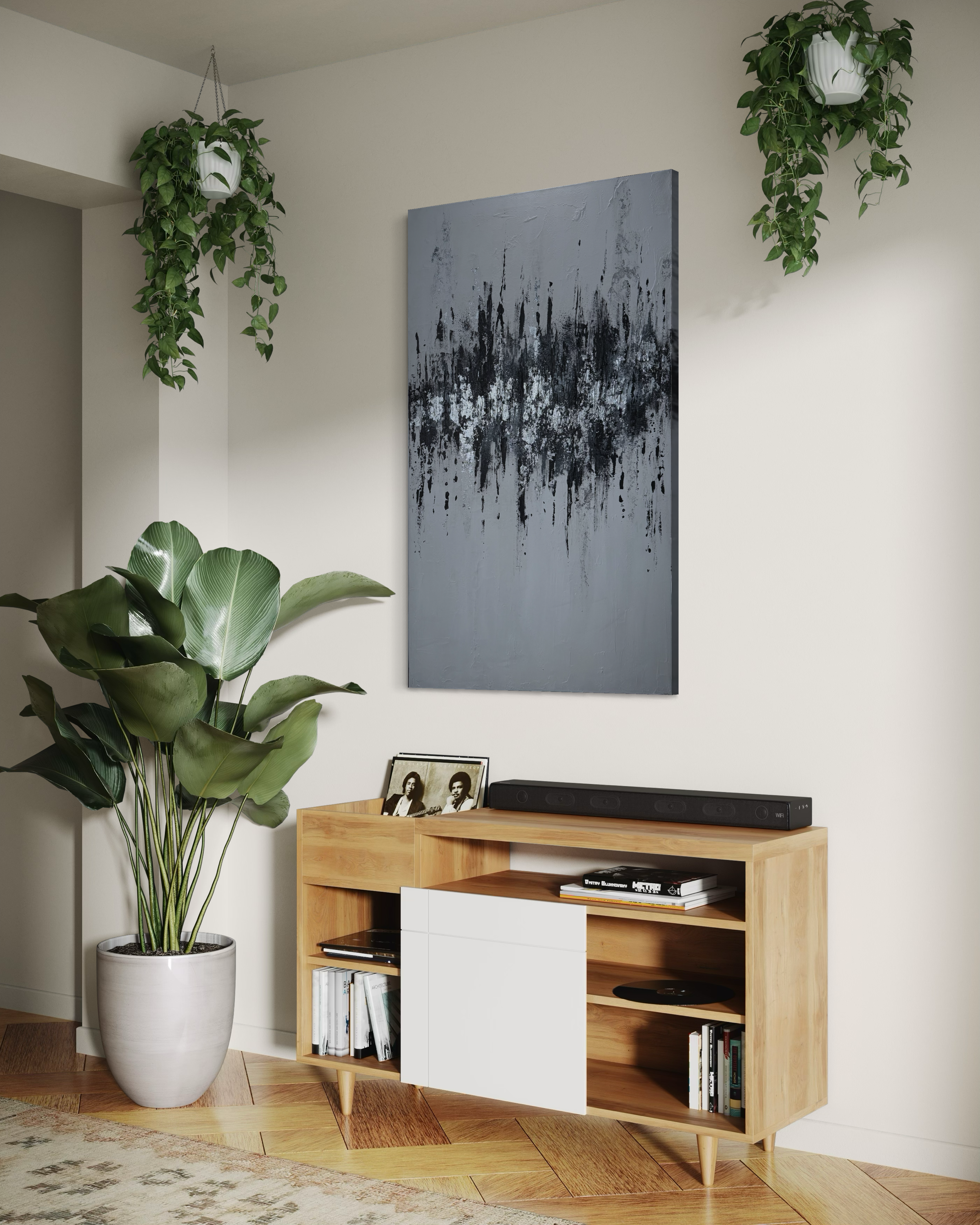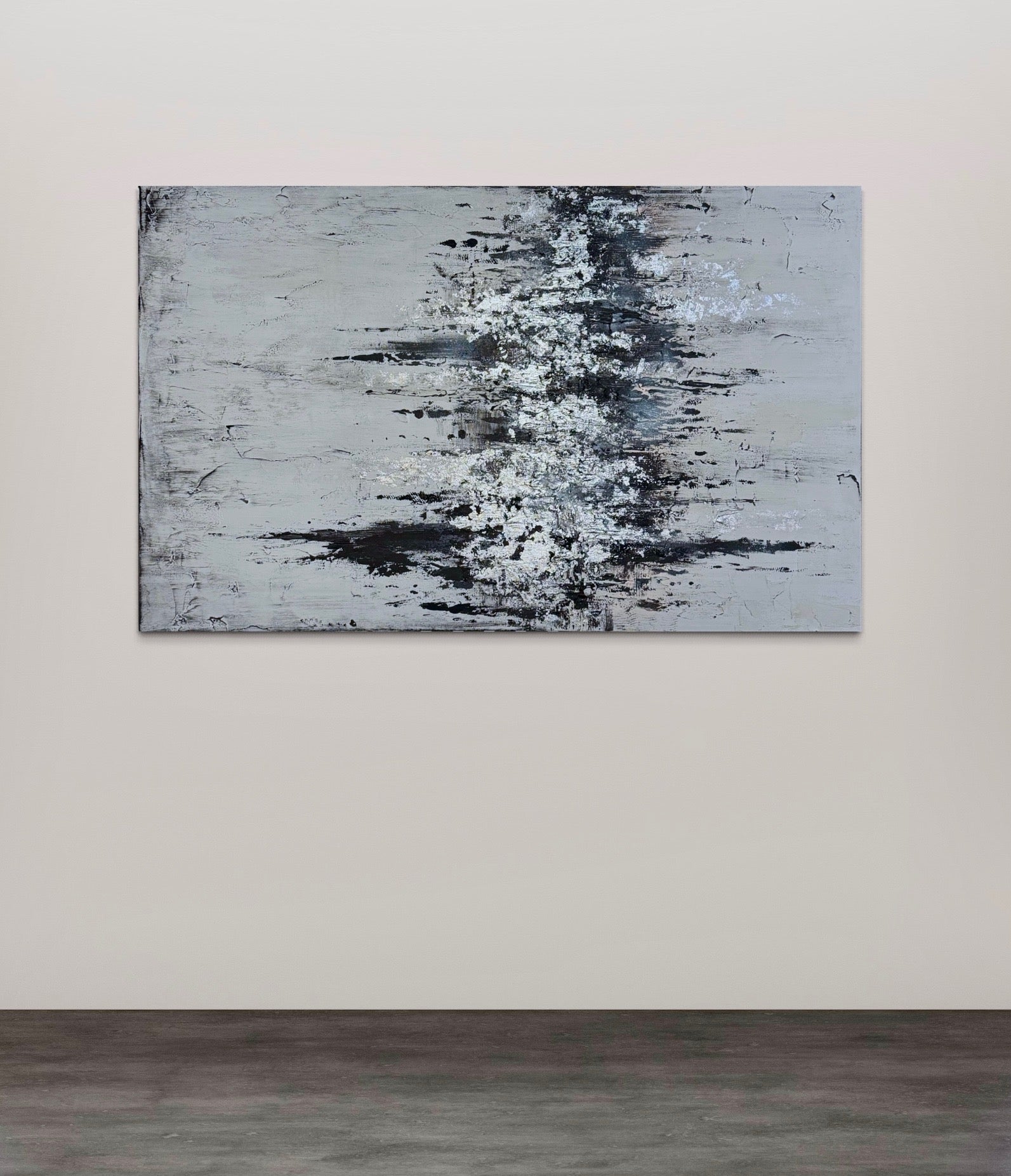 Elevated Frequency is a striking 30x48 inch acrylic and silver leaf composition that merges contemporary abstraction with luminous metallic elements. The interplay of rich acrylic pigments and delicate silver leaf creates dynamic visual movement across the canvas, inviting viewers into a contemplative dialogue between color and light.