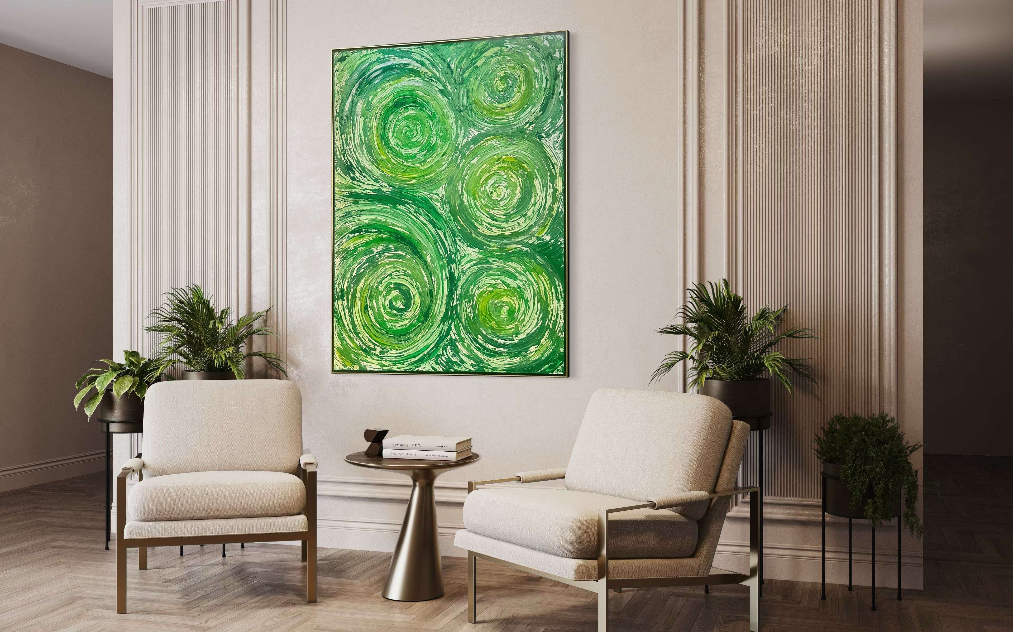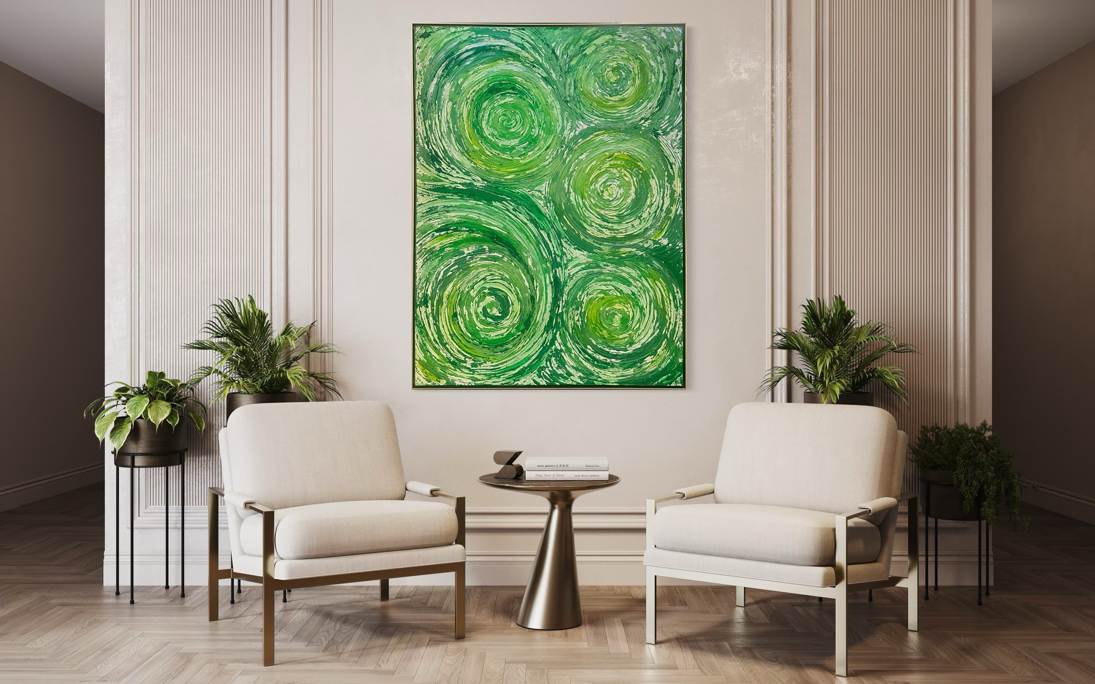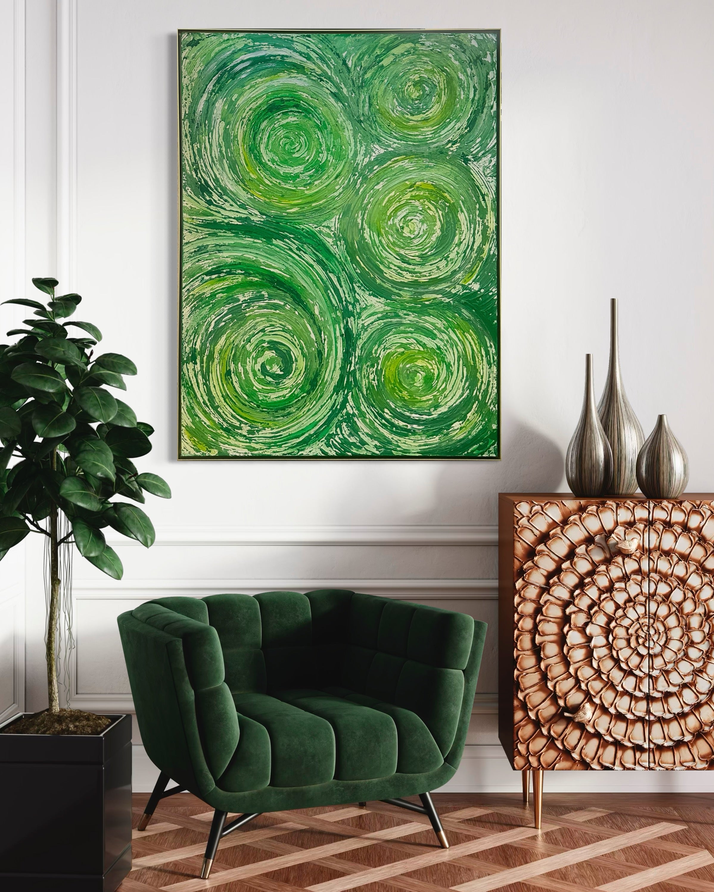 This sophisticated acrylic on canvas artwork, framed in elegant gold, captures the serene essence of an oasis. Its rich textures and harmonious hues evoke a tranquil refuge, perfect for adding a refined touch of calm and beauty to any living space.