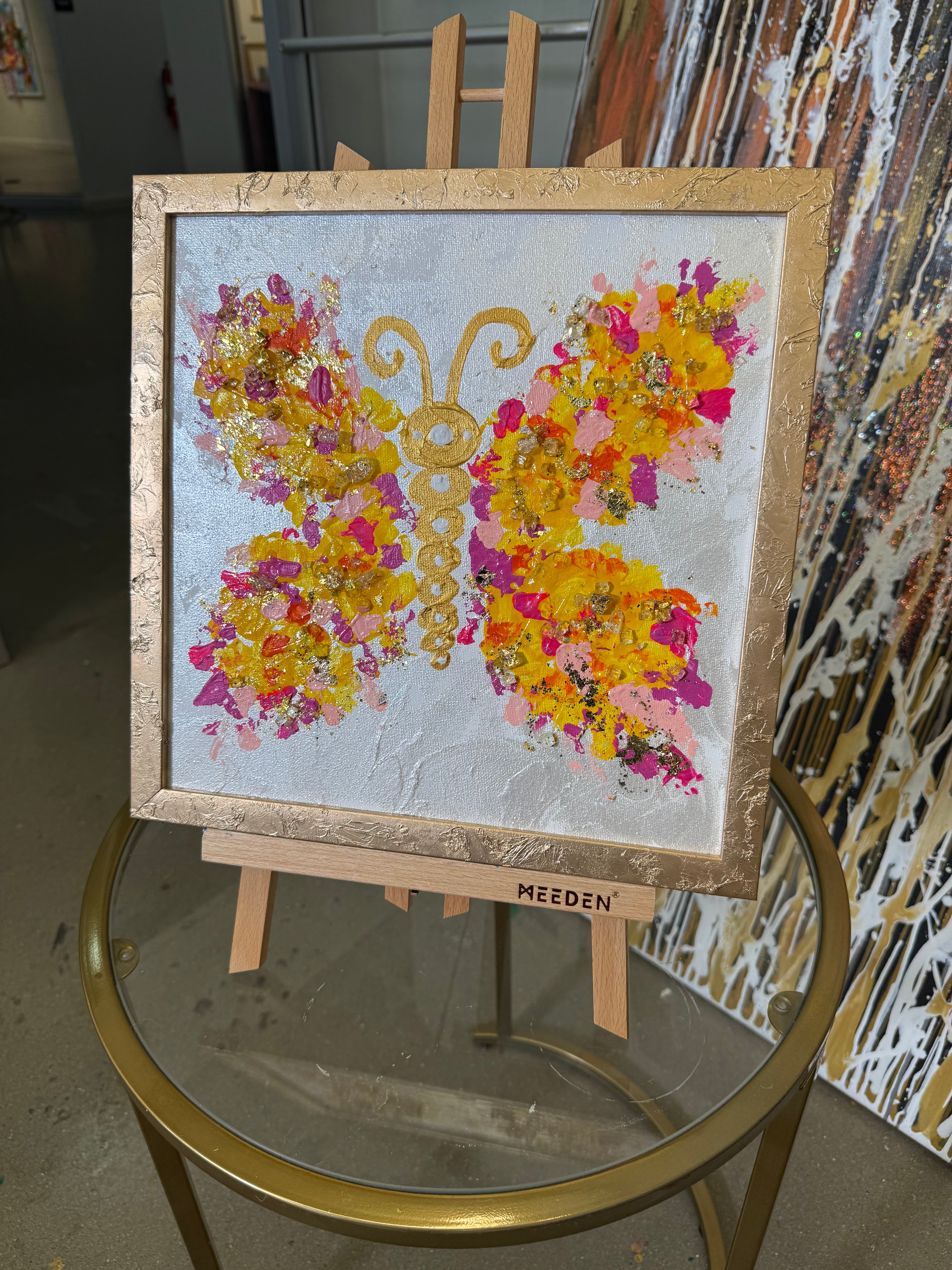 Indulge in the opulent beauty of Sunshine Wings, a 12x12in acrylic painting on canvas. The piece is framed with glass and adorned with gold leaf, adding a touch of sophistication and elegance to any room. Elevate your space with this luxurious and exclusive artwork.