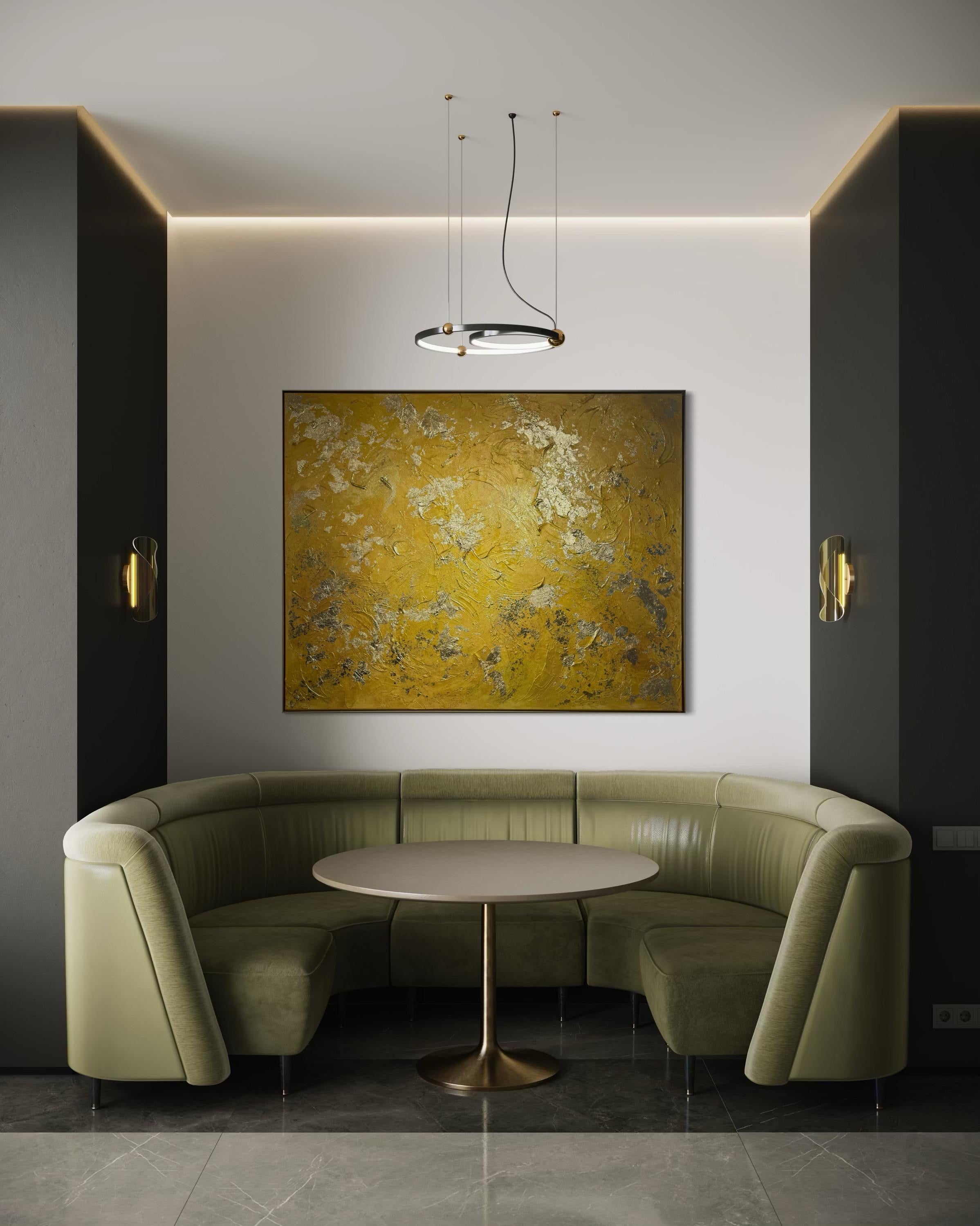 The Midas Touch II is a striking mixed media canvas that commands attention in any space. Measuring 48x60 inches, this substantial artwork showcases layered techniques and rich textures that invite closer inspection. Elegantly framed in gold, the piece radiates luxury and refinement, making it an ideal statement work for collectors who appreciate contemporary art with timeless appeal. Perfect for galleries, upscale residences, or professional environments seeking a sophisticated focal point.