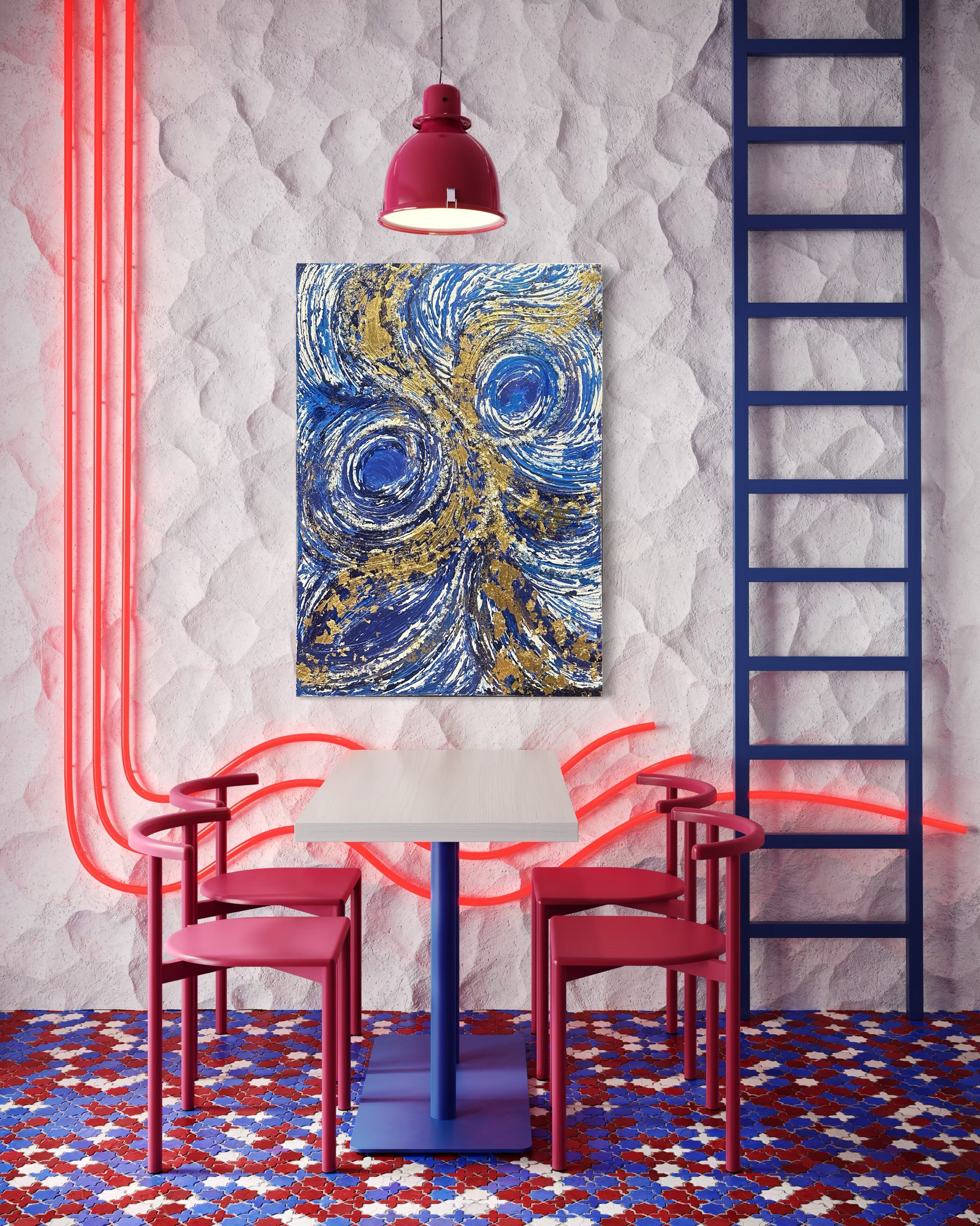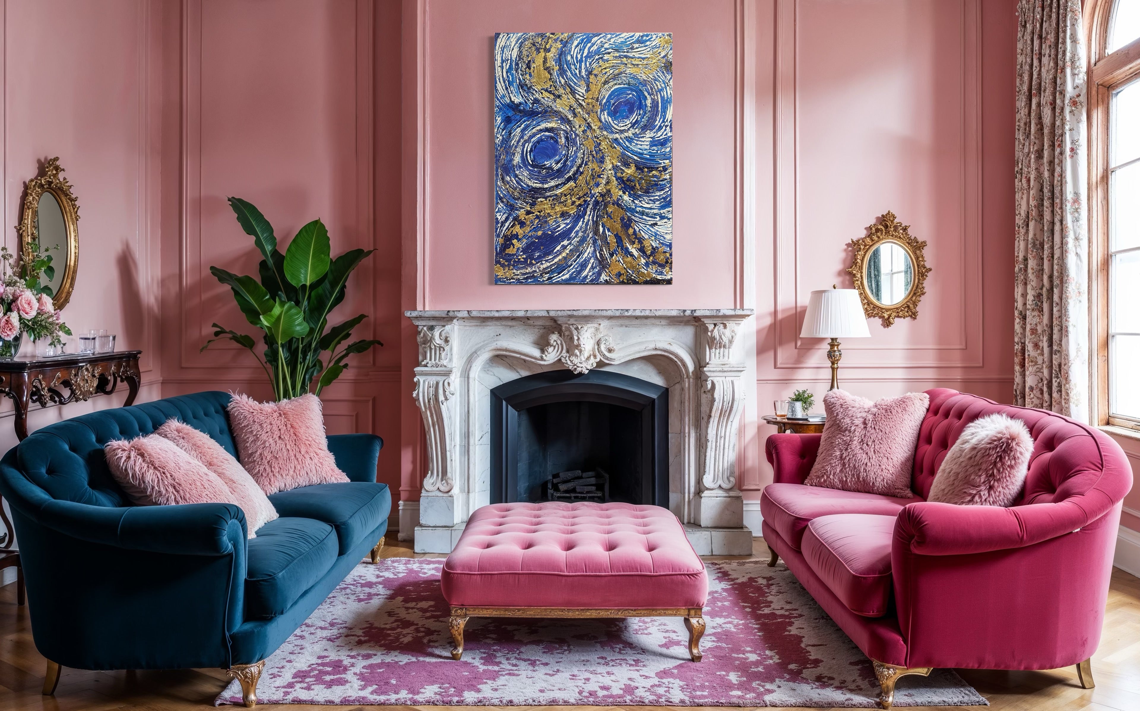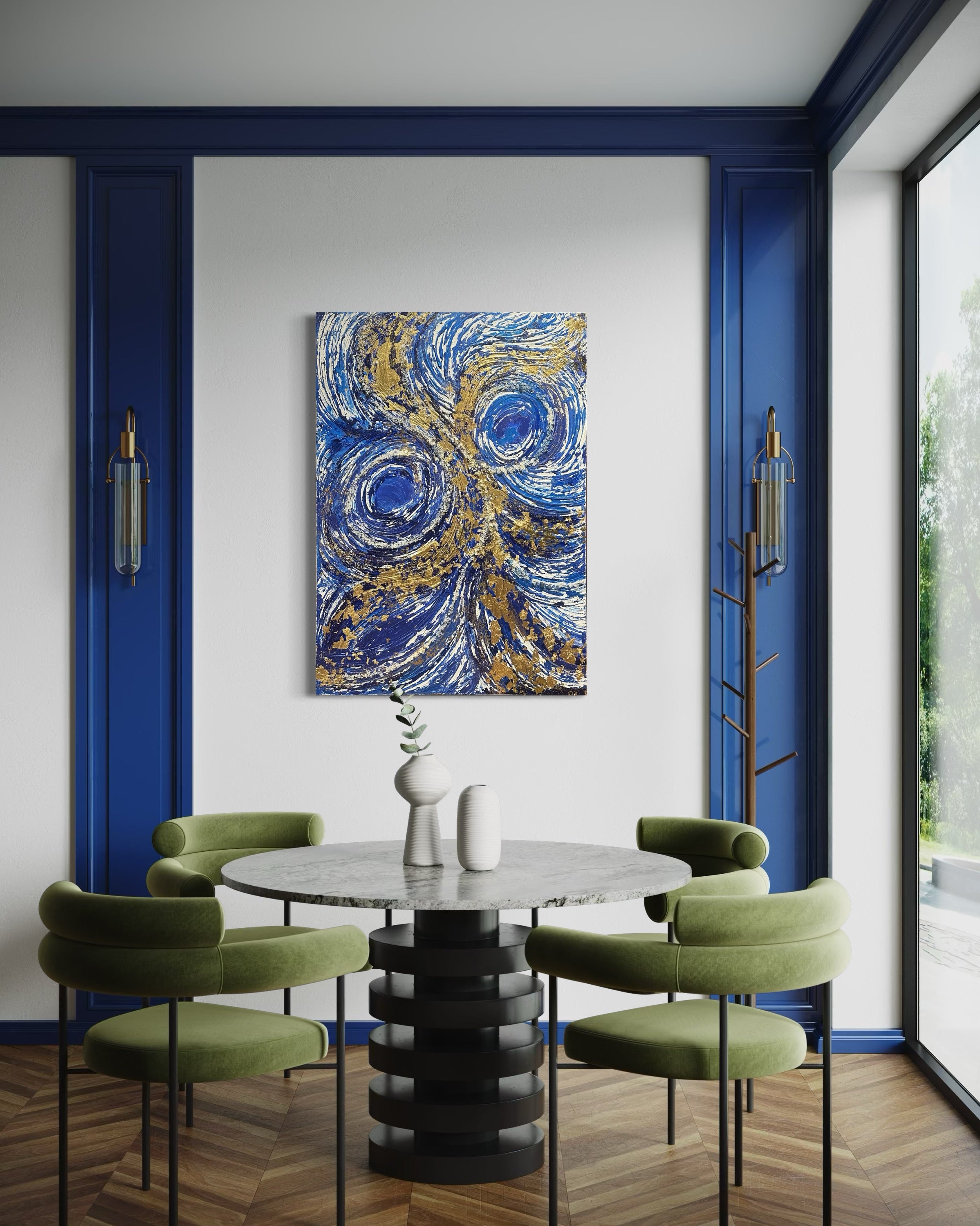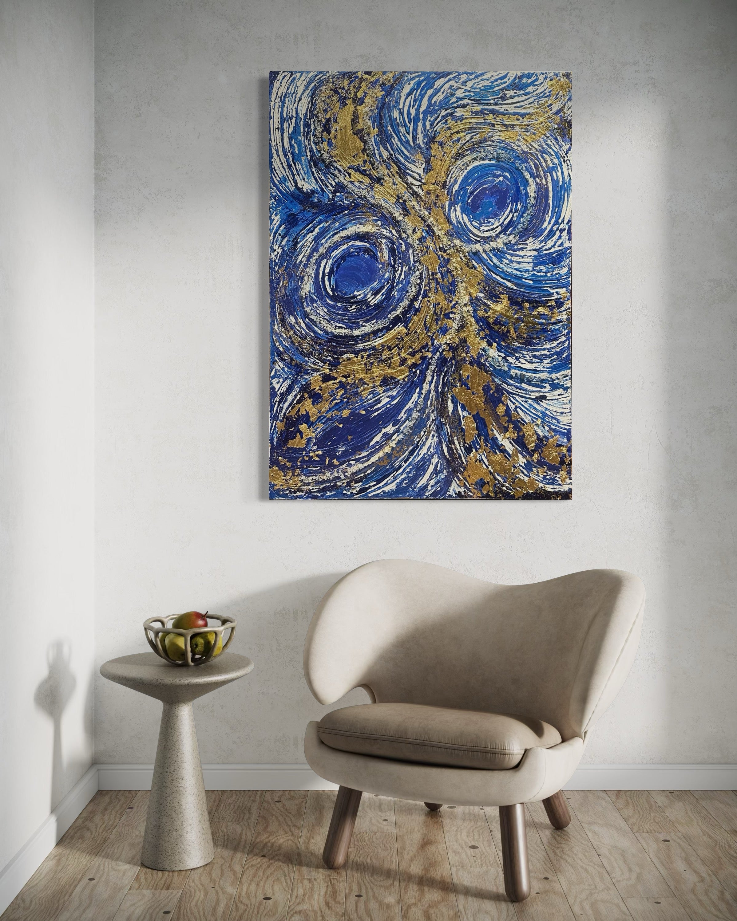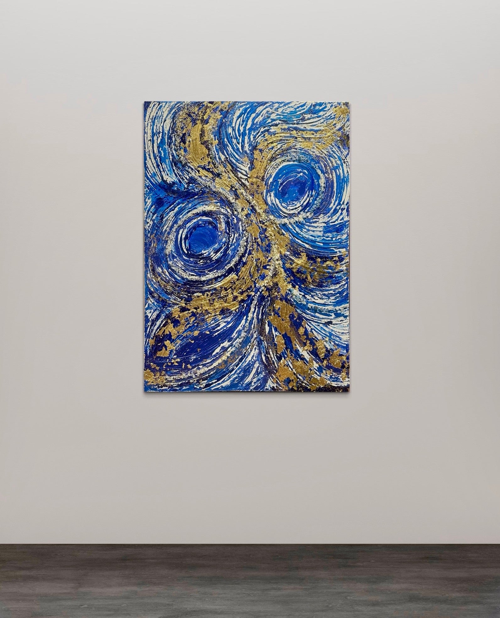 This 30x40 inch mixed media canvas, titled Ultimate Dreams, artfully blends blue and gold tones to create a refined visual experience. The piece’s layered textures and harmonious color palette evoke a sense of depth and elegance, making it a captivating centerpiece for any sophisticated space.
